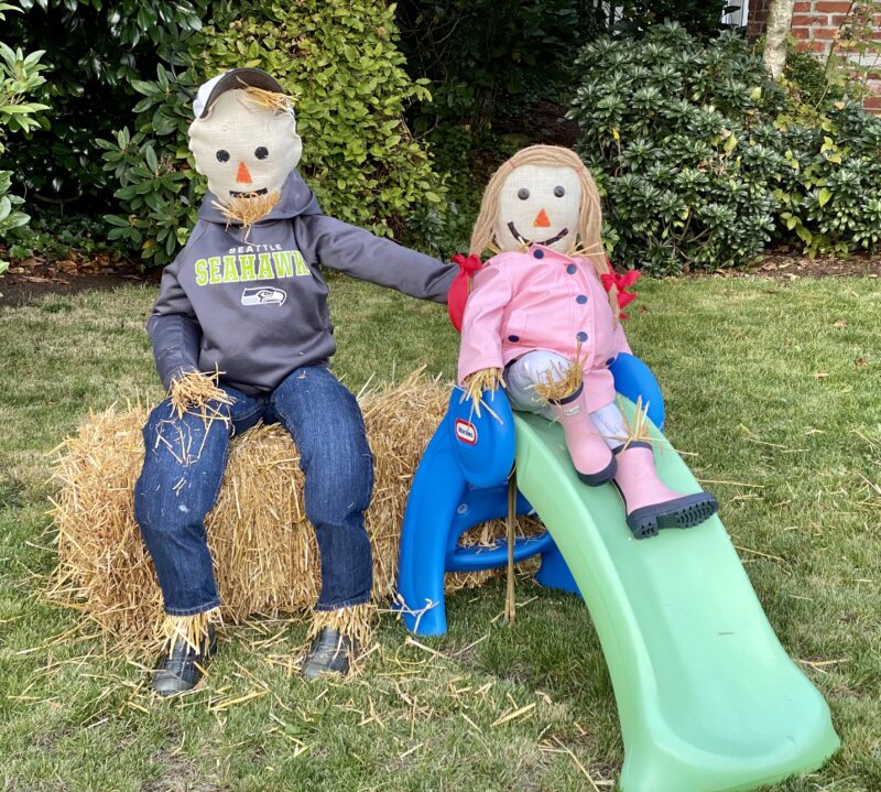 Big brother and little sister scarecrow are best quaranteam ever! They’re playing together in the yard.