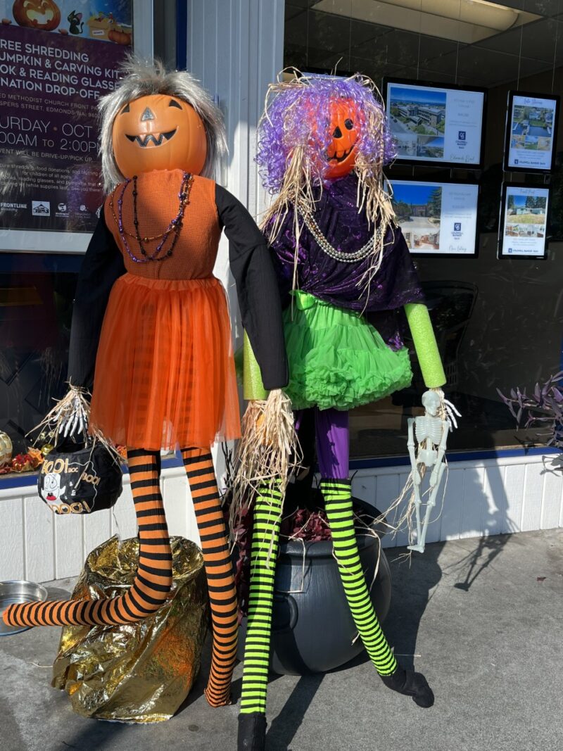 All the Trick or Treaters will be Dancing in the Streets of Downtown Edmonds on Halloween Eve. Our Dancing Queens just couldn’t wait, so they are dancing all month long. (As we were installing our scarecrows 2 little girls walked by and said “Look at the Dancing Queens!’, and that is how they got their name.)