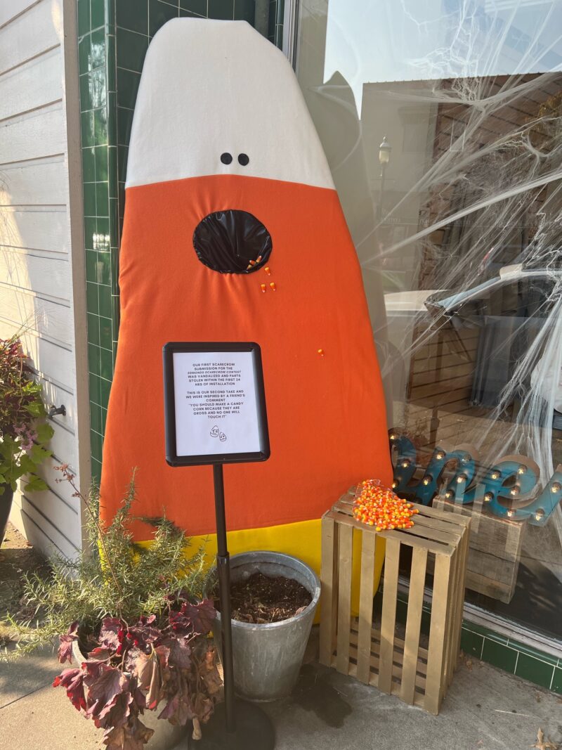 Our first scarecrow submission was vandalized and parts stolen within the first 24 hours of installation. This is our take two – inspired by a friend’s comment that ‘you should make a candy corn because they are gross and no one will touch it”.