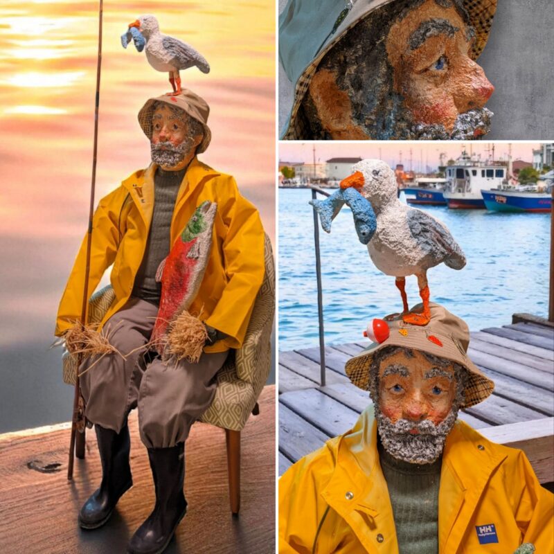 Sal is a friendly fisherman. Even the seagulls like him! A real Scaregull! Made with paper mache.