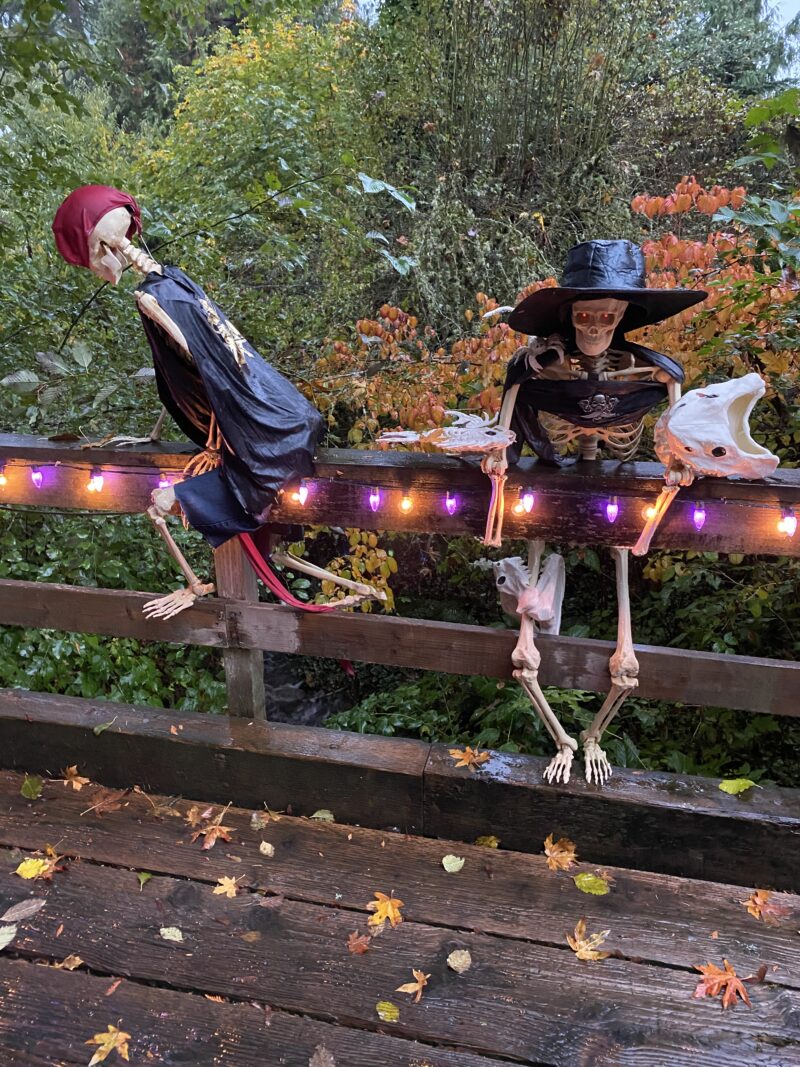 Captain Jonathan Thorn and the remains of the crew of the blighted ship, The Tonquin, have pulled themselves from their watery graves in Clayoquot Sound and up Shell Creek, seeking to plunder and pillage. The horrid tableau must be seen to be believed, if one can countenance such horror. 6 of the damn-ed crew, in Davy Jones’s locker since 1811, have hoisted themselves to haunt on Halloween night, but the sea creatures that snacked on them still bedevil these scalliwags. (Google “The Tonquin” to read more of the tragic tale.)
